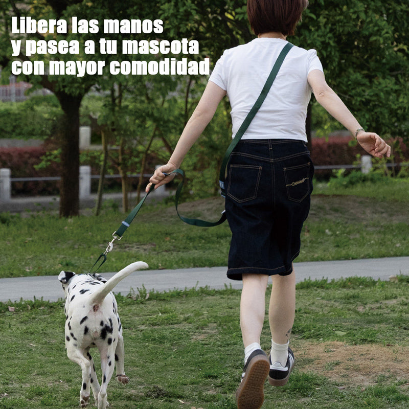 Nuestra correa manos libres se adapta a tu estilo de vida outdoor y urbano: úsala a la cintura para trotar, en modo cruzado para caminar con equilibrio o como correa clásica de mano cuando necesites control total. Todo ello con una cinta de nailon suave pero súper resistente que no se enreda ni irrita la piel de tu compañero.