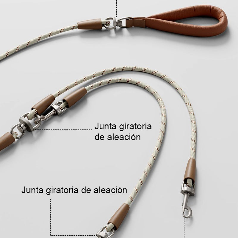 Nuestra correa doble antitorsión incorpora anillas giratorias de aleación en todos los puntos de unión, de modo que cada perro puede cambiar de dirección sin provocar nudos. El resultado: un paseo fluido, elegante y sin tirones, incluso cuando tus compañeros olfatean en sentidos opuestos.