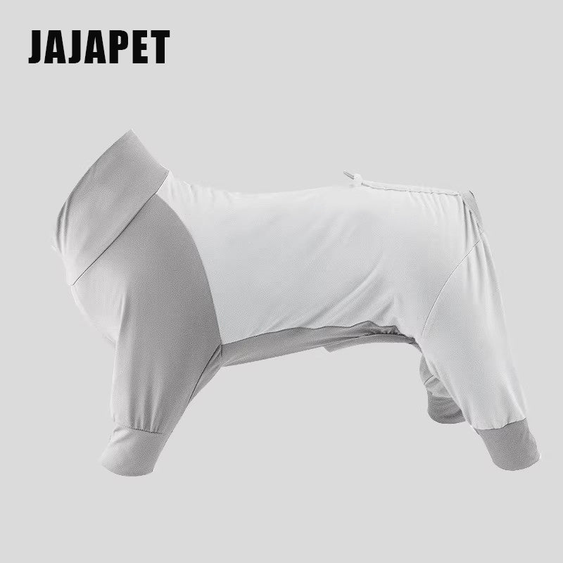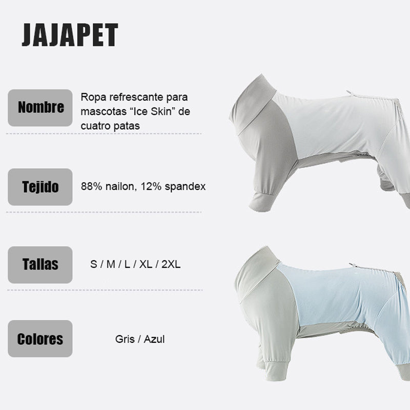 El IceSkin de JAJAPET está confeccionado con tejido “cool-touch” (88 % nailon, 12 % spandex) que refleja los rayos UV y libera sensación fresca cuando se humedece. Su patrón de 4 patas cubre todo el cuerpo, repele la suciedad y evita picaduras de insectos durante los paseos de verano.